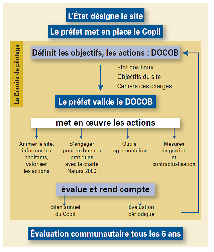 La mise en oeuvre de la démarche Natura 2000 sur un site comporte différentes étapes, depuis l'installation du Comité de pilotage (COPIL) jusqu'à la validation du Document d'objectifs (DOCOB) et la mise en oeuvre d'actions de gestion.