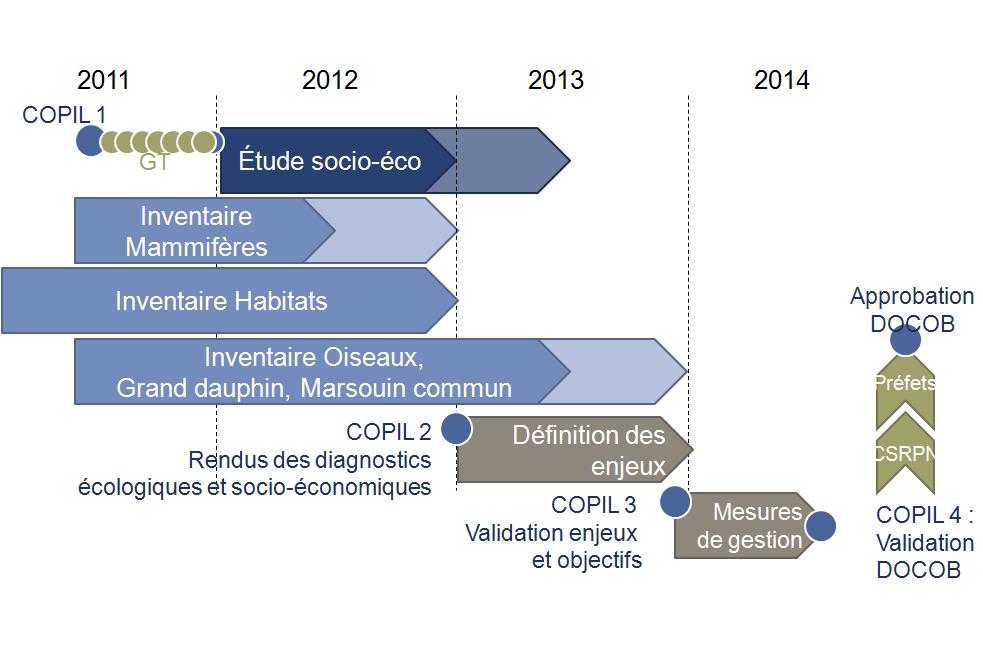 La démarche de mise en place du DOCOB du site des Bancs des Flandres se déroule en 3 phases successives :
