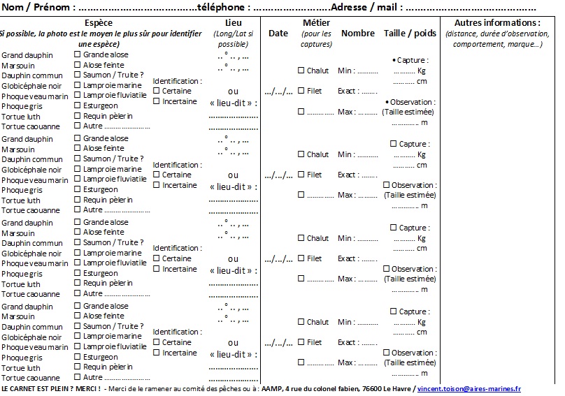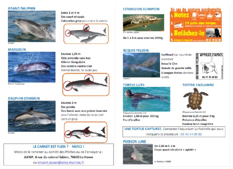 Un carnet d'observations est à la disposition de tous les usagers du milieu marin pour faciliter la transmission de vos données. Il peut vous être adressé en format papier sur simple demande, ou être téléchargé en cliquant sur les images suivantes : Carnet d'observation Feuillets internes (pour les données) Les observations sont à transmettre à Sophie PONCET (sophie.poncet@ofb.gouv.fr / 02 32 85 90 89) qui se chargera de les relayer aux coordinateurs des différents réseaux. |